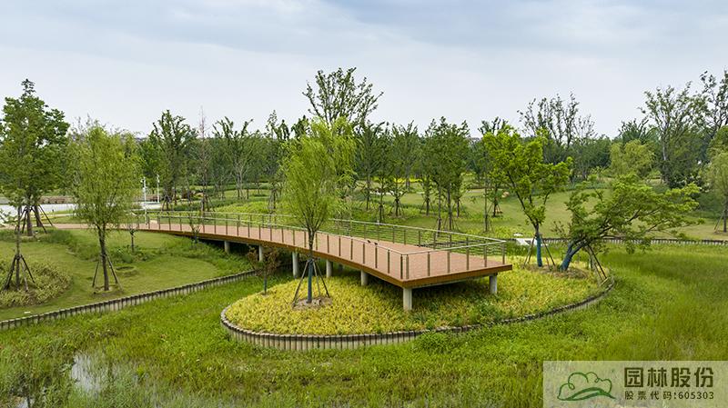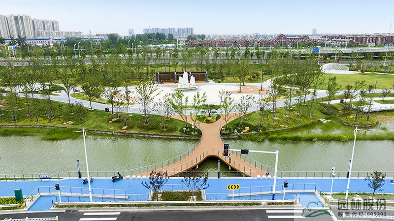 水系貫穿整段綠地,綠道、景觀橋穿插其中,沿途設置平臺、廊架等,充分呼應水網(wǎng)與路網(wǎng)交織主題。水系駁岸既有草坡入水,又有仿木樁駁岸,點綴景石,搭配疏密相間的綠化,共同形成了生態(tài)多樣的生態(tài)水岸。